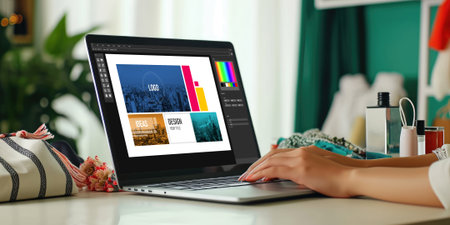Graphic designer software for modern design of web page and commercial brisk ads showing on the computer screen