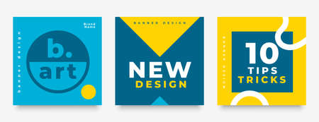 Set of artistic abstract universal card templates with simple geometric shapes and hand drawn doodle texture. Social media web banner. Bright colored isolated on white background cover template.