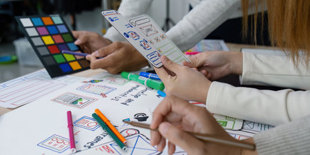 Close up ux developer and ui designer brainstorming about mobile app interface wireframe design on table with customer breif and color code at modern office.Creative digital development agency