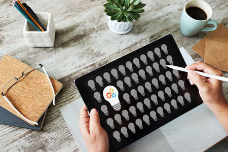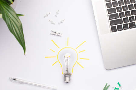 Top view on working place with yellow lamp as a symbol of idea coming, creativity. Designer's working space.