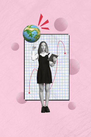 Poster banner collage of clever smart teen schoolkid secondary school student read fiction story about earth world