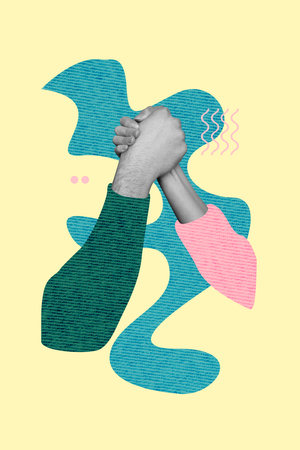 Trend artwork composite image photo collage of yellow caricature two arm hand appear hold together show gesture partnership unity trust