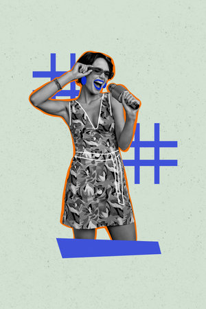 Creative trend collage of funny young female sing hold microphone karaoke blue weird bizarre unusual fantasy billboard