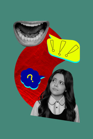 Poster trend sketch 3D photo collage of huge mouth loud scream conversation app social media network small girl confused face question