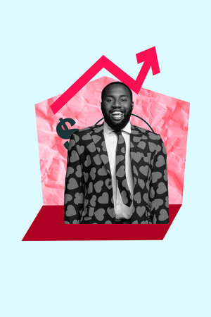Vertical sketch 3d collage poster of happy businessman arrow development dollar currency income usd budget winning jackpot