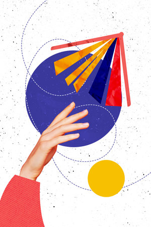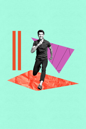 Pop image sketch 3d collage poster of happy businessman run persistence goal achievement chart statistics career growth concept