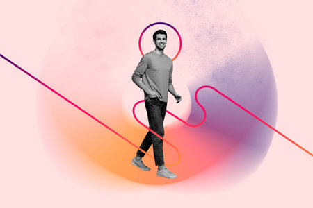 Composite art 3d creative image collage of happy handsome man walk colorful doodle line motion wear casual clothes on drawing background