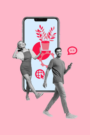 Exclusive artwork banner creative collage of happy business partners girl guy stand phone screen gearwheel settings flower pot diagram