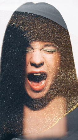 Aggressive portrait. Mental disorder. Angry female. Bad emotional feeling. Glitter in furious yelling woman silhouette double exposure.