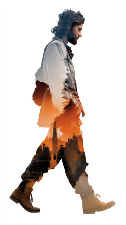 A man walking with cityscape double exposure effect