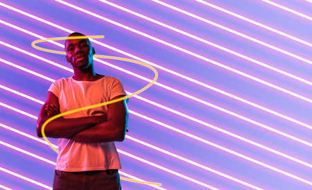 One African young man isolated over purple white striped background in neon light. Flyer, poster