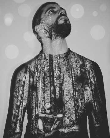 Abstract Double Exposure of Person and Nature with Colorful Light and Branches