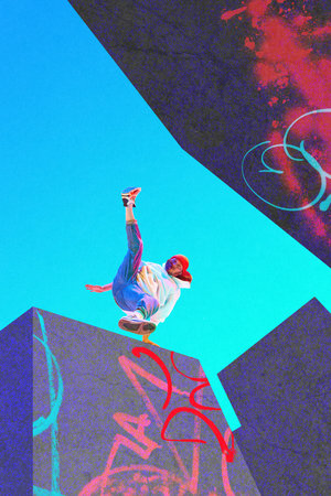 Athletic man in sport style clothes doin tricks, practicing parkour outdoors. Jumping on buildings. Contemporary art collage. Sport. Urban style