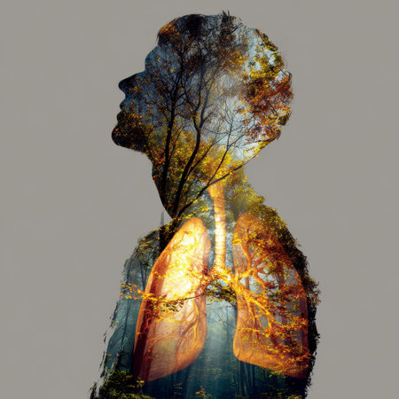 Double exposure of man's silhouette with a forest and tree-like lungs inside, symbolizing harmony with nature..