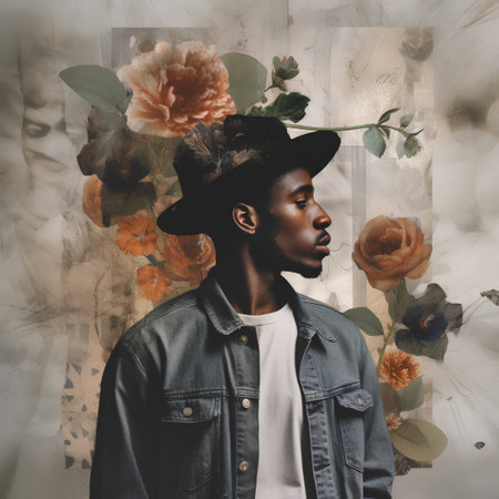 Handsome african american man in hat with flowers on grunge background