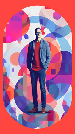 Handsome young man in casual clothes and eyeglasses standing on colorful abstract background. Vector illustration.