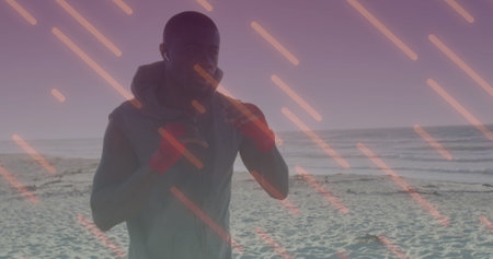 Image of data processing over african american man doing push ups. Global business and digital interface concept digitally generated image.