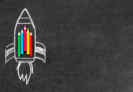 A rocket is drawn on a school board with chalk, colored pencils are laid out