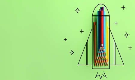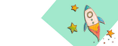 Drawn rocket with colorful pencils on green background with space for text
