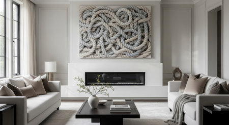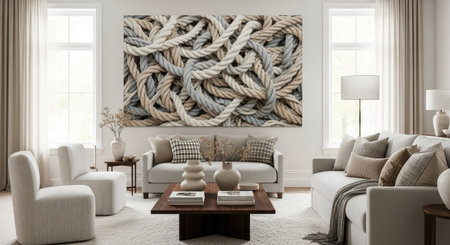 A well-lit interior scene presents a living room with contemporary furnishings and decor. The space is characterized by neutral tones, enhancing a sense of calm and spaciousness. A large artwork featuring intertwined ropes hangs above the sofa. This image may be suitable for various commercial purposes, including home decor and lifestyle content.