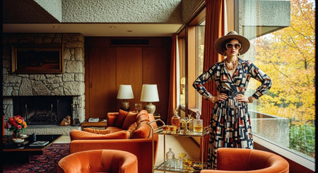 A stylish woman in a patterned dress and hat stands in a modern living room with large windows, showcasing autumn foliage outside