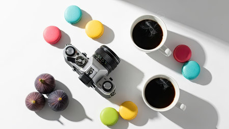 top view of camera and cups of coffee on white background with shadows