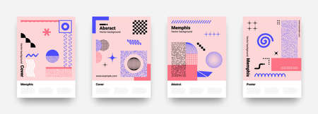 Memphis abstract posters. Notebook cover graphic design. Trendy geometric shapes. Pop art banners set with copy space. Vector curved lines, contour circles and decorative mesh textures