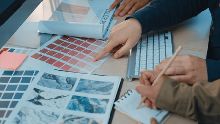 Two colleagues creative graphic designer working on color selection and drawing on graphics tablet at workplace, Color swatch samples chart for selection coloring.