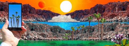 Vibrant image of fantasy landscape from views near the birthplace of Aphrodite with human hand and smart phone