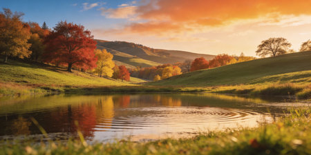 Beautiful autumn landscape with lake and mountains in the background at sunset