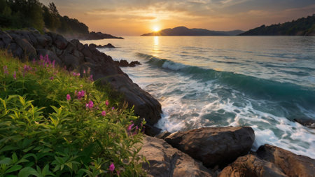 Witnessing the mesmerizing beauty of ocean waves crashing against rocks under a stunning sunset sky
