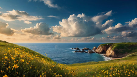 Coastal landscape with yellow flowers and blue sky with white clouds
