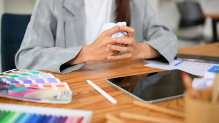 Close up view of female graphic designer working with computer and designer supplies in office room