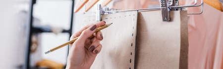 Cropped view of designer with pencil near sewing patterns in atelier, banner