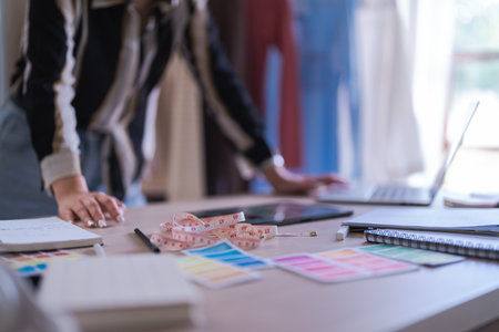 Fashion designer women reading data on laptop to work designing clothes for creative new collection.