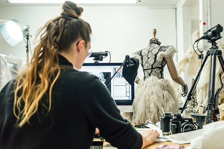 Creative process of young designer sketching ideas on a tablet in a vibrant fashion studio