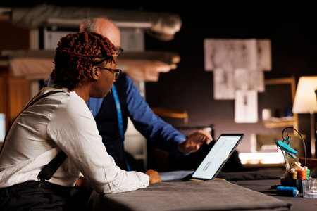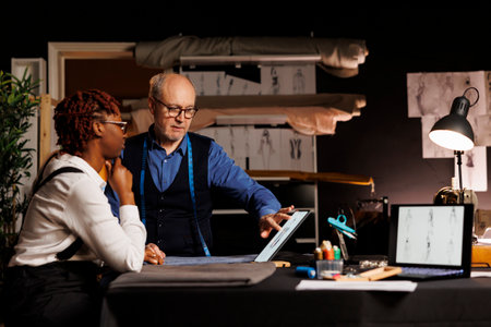 Elderly master tailor brainstorming outfits with african american apprentice for client comissioned premium dress. Expert couturier and assistant working in atelier shop workspace