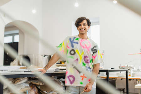 happy fashion designer smiling at camera near sewing patterns on desk, blurred foreground