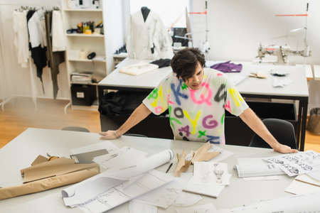 creative designer standing at workplace near sewing patterns and sketches in fashion studio
