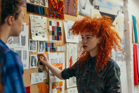 Female fashion designer working in her studio. Red-haired woman with curly hairstyle.