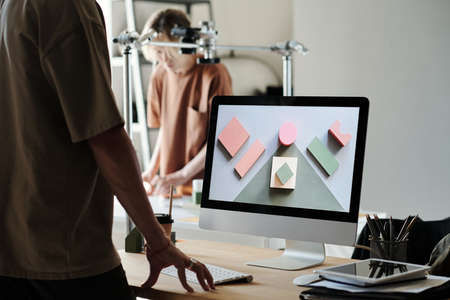 Young male photographer standing by desk with computer monitor in studio and looking at photo of composition on screen