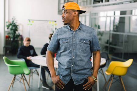 Cheerful african american hipster guy standing in loft office during free time, happy dark skinned man enjoying his job. young team of freelancers working in new project at office.