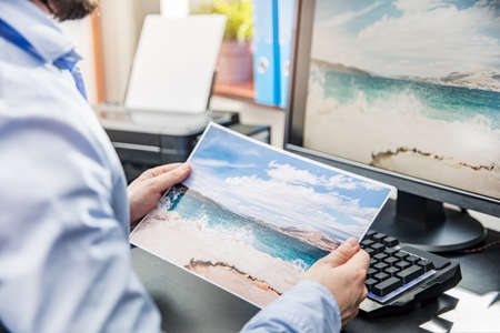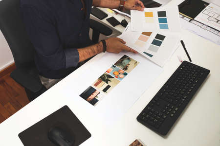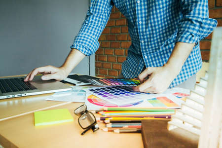 Retouching images in special program.Portrait of graphic designer working in office with laptop,monitor,graphic drawing tablet and color palette.Retoucher workplace in photo studio.Creative agency.