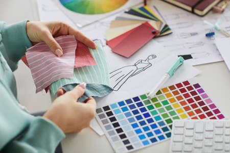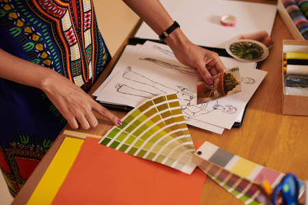 Close-up of unrecognizable female designer sitting at desk with papers and fashion sketches and choosing fabric for dress