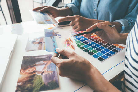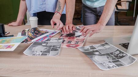 Close up with the hands of two designers who choose some pictures. Team work and planning