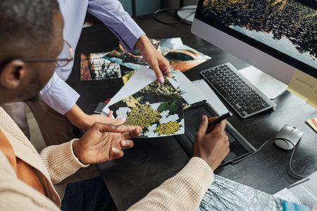 High angle close up of two modern young people discussing black and white pictures while choosing artwork for interior decor, copy space