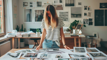Cropped shot of female photographer looking at photo prints while working in studio, copy space