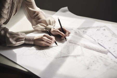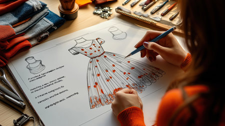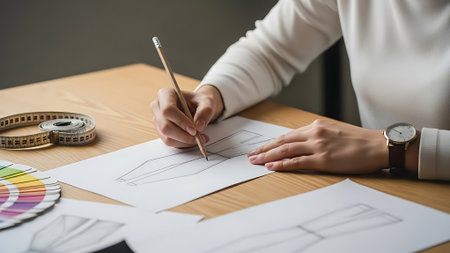 A person creating fashion designs on paper with a pencil and measuring tape on a wooden table.