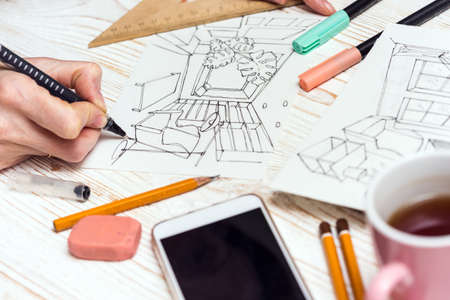 designer makes a sketch of the interior. background - drawing, markers, pencil, eraser, ruler, calculator