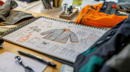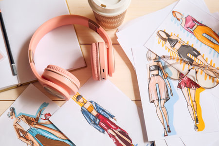 Fashion design sketches and tools scattered on a table, showing the creative process behind clothing creation